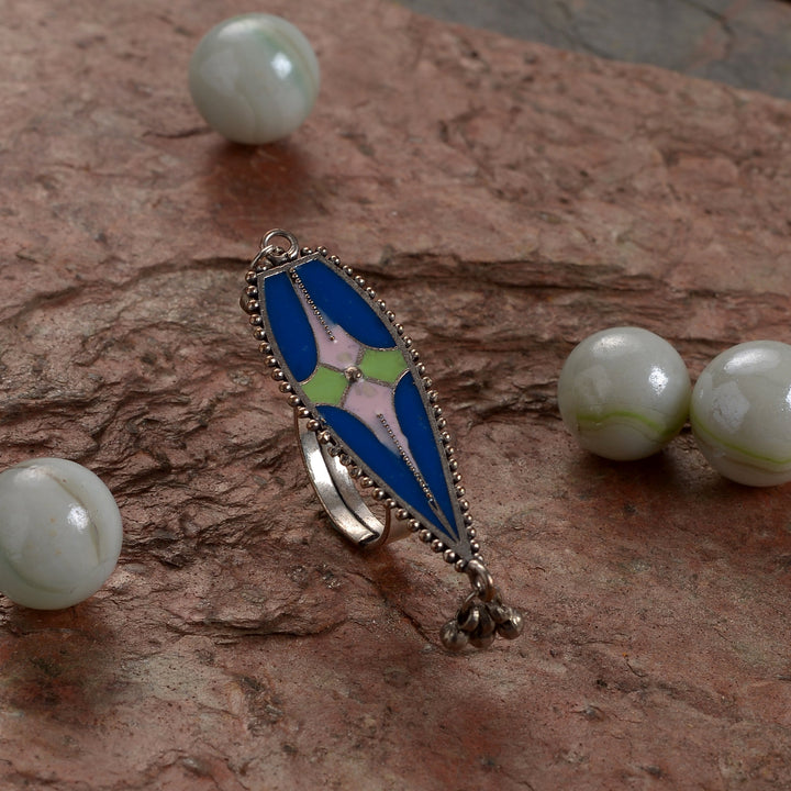 Unique and artistic, this handpainted brass ring adds a splash of color. Its vibrant design makes it a perfect statement piece. The adjustable band ensures a comfortable fit, making it an eye-catching addition to your jewelry collection.