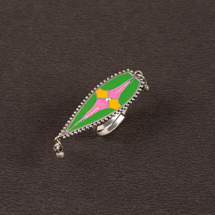 Unique and artistic, this handpainted brass ring adds a splash of color. Its vibrant design makes it a perfect statement piece. The adjustable band ensures a comfortable fit, making it an eye-catching addition to your jewelry collection.