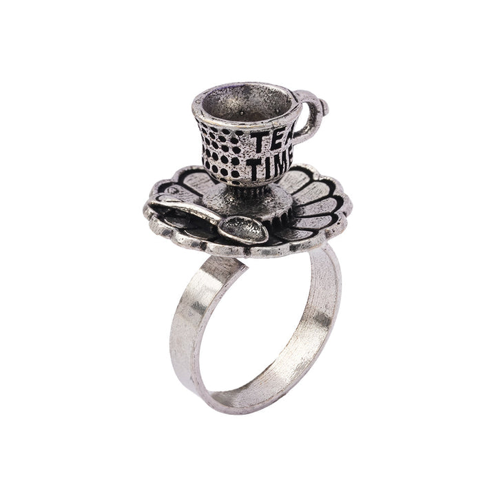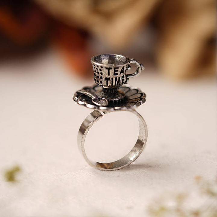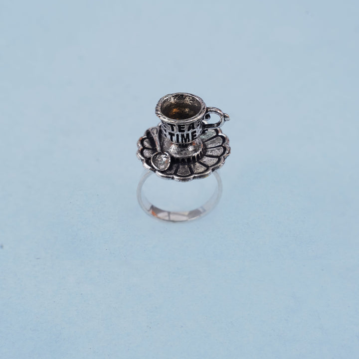 Charming and unique, this tea cup-plate silver oxidised ring showcases a whimsical design with a vintage finish. The adjustable band ensures a perfect fit, adding a touch of fun to your style.